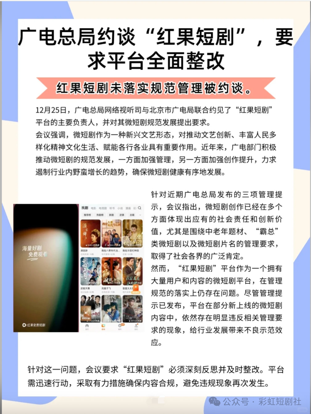 第四季度广电屡次下场监管,从限制霸总题材到批评短剧狗血剧名,年底还不忘把红果一顿约谈,可见短剧发展走到一个新阶段。有了官方监管,希望2025年短剧有进一步突破,用丰富的题材和立体的人设、新颖的剧情打造更多高质量作品,短剧精品化的未来不再是梦!